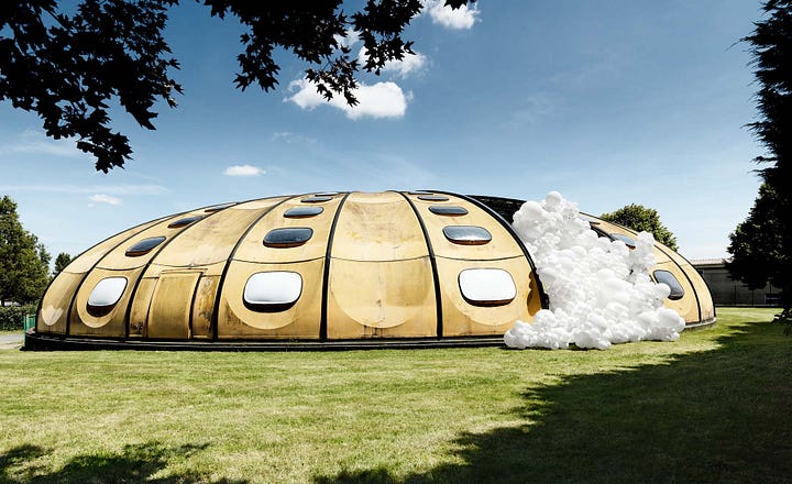 Charles Pétillon, Mutations 2: Charles Pétillon (1973–) is a French artist and photographer who is known for his installations of white balloons—he calls them “invasions”—in natural environments and architectural areas. Their forms are a unique way of interacting with space, spicing up landscapes and buildings with a bit of whimsical strangeness, ghostly absurdity. “These balloon invasions are metaphors,” says Pétillon. “Their purpose is to change our perspective on things that we encounter every day without paying attention.”