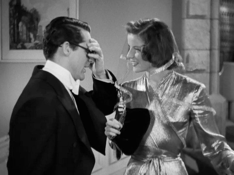 Susan Vance is the unhinged of comedy, not the unhinged of tragedy. Her flaws and faults draw out laughs from us, not tears of commiseration or gasps of horror or grimaces of revulsion. She is the human embodiment of chaos. “Chaos is what killed the dinosaurs, darling,” J. D. tells Veronica in Heathers. Well, I’m no paleontologist, so maybe. But I think chaos is simply another name for good old-fashioned fun. Chaos is life swinging her feet, barely suppressing her giggles. Chaos is the beginning of the universe, ultra-hot particles bumping into one another. Chaos is what causes Katherine Hepburn to bump into the ultra-hot particle Cary Grant. And keep bumping into him, again and again. Nobody tells you how effective annoyance is as a seduction tactic. Exasperate a man, then use your cuteness to win his forgiveness. It’ll have you clinging to his hand as you dangle from scaffolding, the wreckage of his life’s work scattered 15-20 feet below you, in no time.