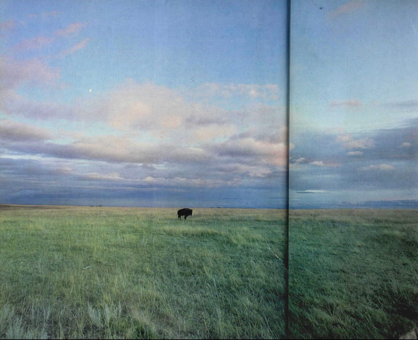 The grass waves like a sea but no sea is here; if grass were sea, the bison would be a boat, bobbing against the clouds that crowd, heap, gather, darken, smear towards horizon. It is as though the wind were a voice that herds the grass and clouds together. They converge, and from this vantage point, his near-black brown’s a blot. He is a non, no-being, nought, a nothingness, a void: this twofold vastness that ripples off the page (one page of plains, one page of heavens) finds him balky, hard, meets its resistance in him. Standing here, he almost seems a punctuation mark from older, stranger language than our own. This mystery of wind through waving grass, each semitone of stir and quiver, why the heaped foreboding in the clotting clouds— he understands it with the musk and music of his animal being. God once stood like this, lonely upon the ledge of his creation.