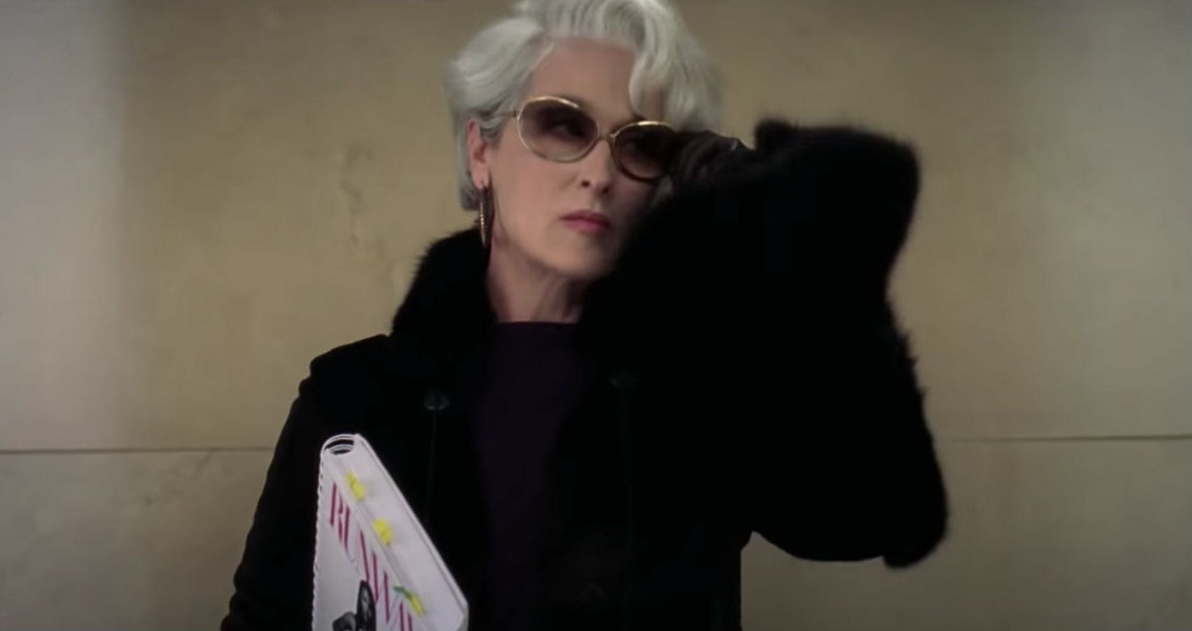What is all this flurry and flummox, all this rustle and rush for—or rather, who? The answer is Miranda Priestly (Meryl Streep), for whom car doors open and the golden gates of the Elias Clarke office building swing wide, for whom young women step out of elevators they were in first, apologizing, deferent, for whom loins are girded, chaos is cleared, and panic induced, for whom the silken gears and the beaded cogs of fashion grind and churn. Ding! The elevator doors open. There she is, the magisterial sweep of her white hair coiffed to perfection, her hands gloved in leather, her form clad in black, the mockup of Runway’s next issue tucked beneath her arm. With an imperial toss of her head, she takes off those unforgettable Gucci sunglasses, and we at last come face-to-face with the commander of the whole operation, the captain of the ship, the general of the army, Runway’s editor-in-chief.